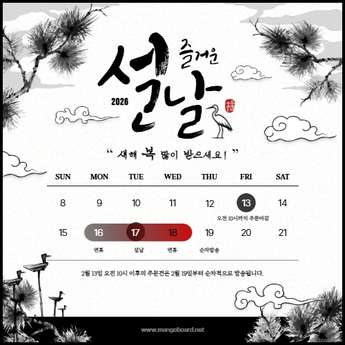 2월 13일(금) AM 10시 "이전" 주문 [택배발송] 2월 13일(금) AM 10시 "이후" 주문 [택배마감] -> 이후 결제 건의 경우 "2월 19일(목)" 일괄 발송합니다.